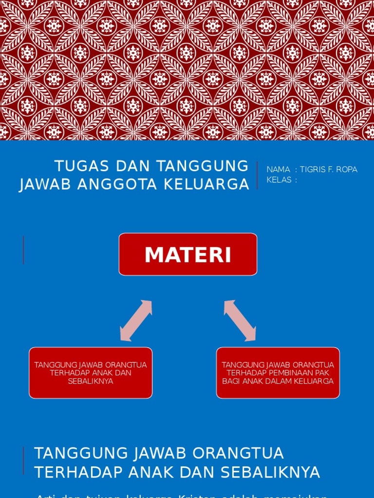 Sejak anak dibesarkan, peran orangtua tidak dapat diabaikan, baik pemberian nutrisi, pemeliharaan, pendidikan, dan keteladanan bagi perkembangan anak, baik untuk perkembangan fisik, intelektual, sosial, emosional maupun. Hal ini adalah tanggung jawab orang tua untuk memuridkan anak mereka yang tuhan karuniakan. Anak berkewajiban memelihara kelangsungan hidup orang tua ketika orang tua tidak lagi dapat memenuhi kebutuhannya. Kewajiban kepala keluarga menurut agama kristen. Didiklah orang muda menurut jalan yang patut baginya, maka pada masa tuanya pun ia tidak akan menyimpang dari pada jalan itu (ams. Namun, anak tidak berkewajiban membuat orang tua senang secara membabi buta; Tanggung jawab kepada orang tua lebih bersifat fisik ketimbang emosional. Tanggung jawabku terhadap keluarga 1. Dalam alkitab kita menemukan tugas utama dalam mendidik anak ada pada orang tua. Oleh karena itu, orangtua memiliki peran yang besar dalam memuridkan anak di dalam tuhan sebelum anak dimuridkan oleh dunia. Tanggung jawab atau ekwajiban ayah terhadap keluarga begitu besar. Namun, anak tidak berkewajiban membuat orang tua senang secara membabi buta; Penjaga bertanggung jawab melindungi dan memelihara anak.